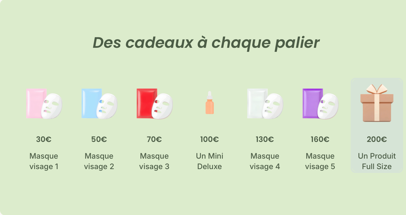 Dès que tu atteins un palier, tu peux choisir un cadeau parmi une sélection proposée et l’ajouter à ton panier avant de finaliser ta commande.